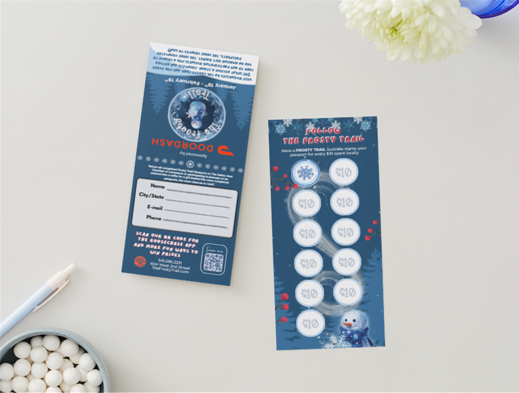 The Frosty Trail is proudly sponsored by DoorDash. Their support helps fund passports, window clings, promotions, and prizes — all to encourage shopping local and supporting The Dalles business community during winter months.